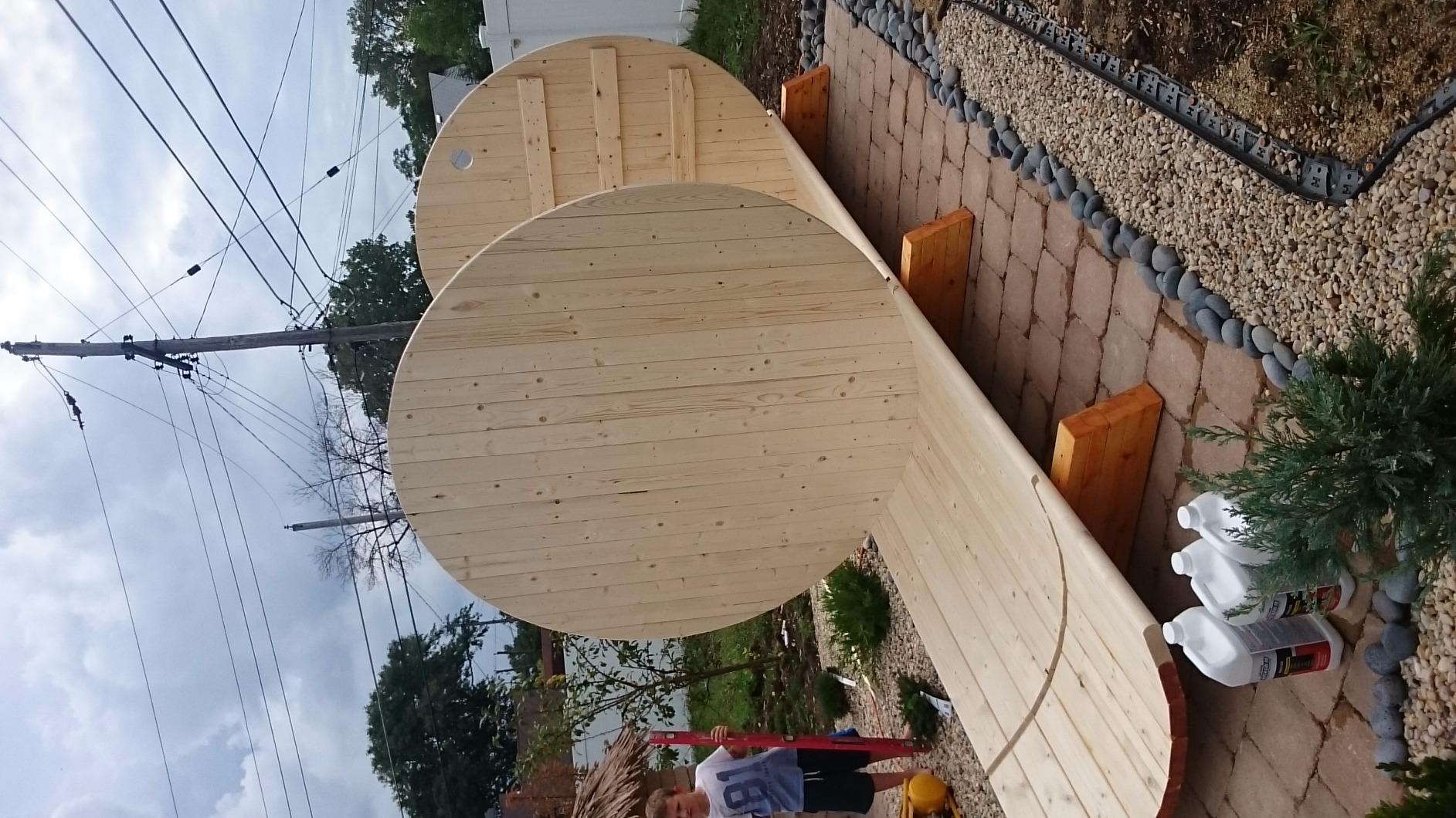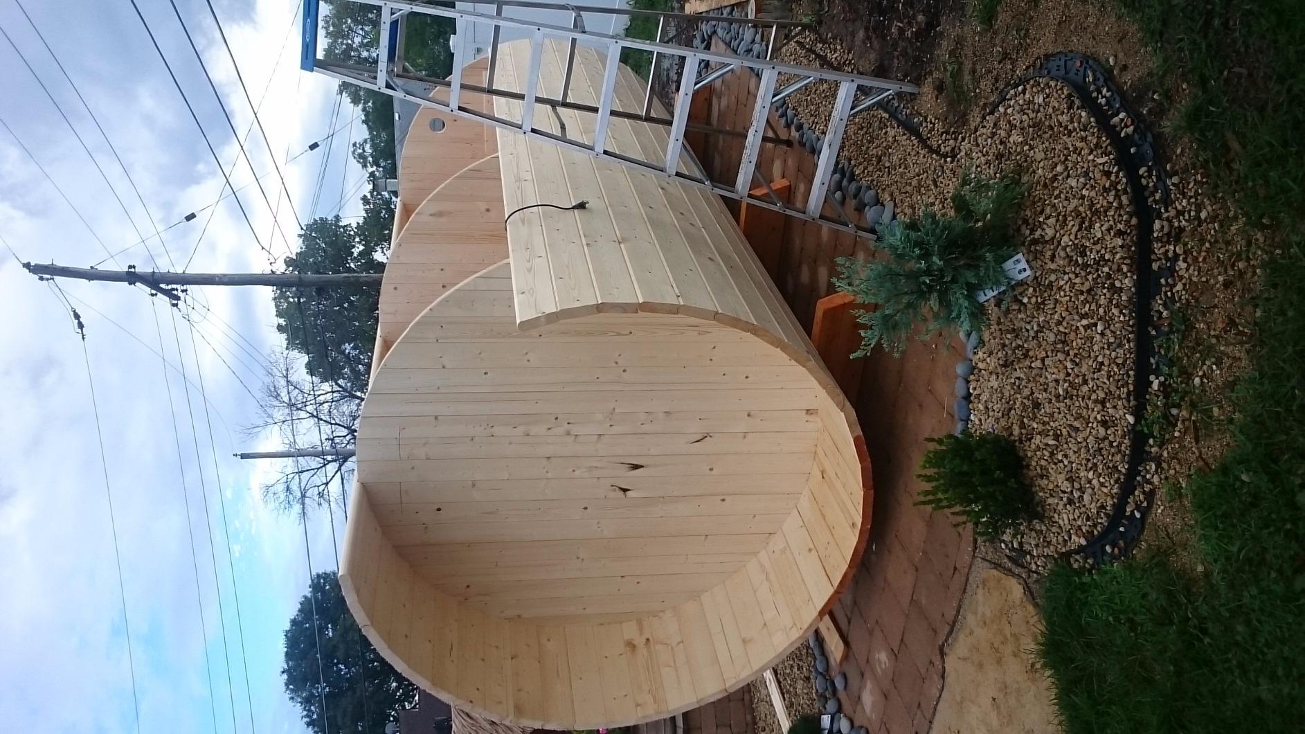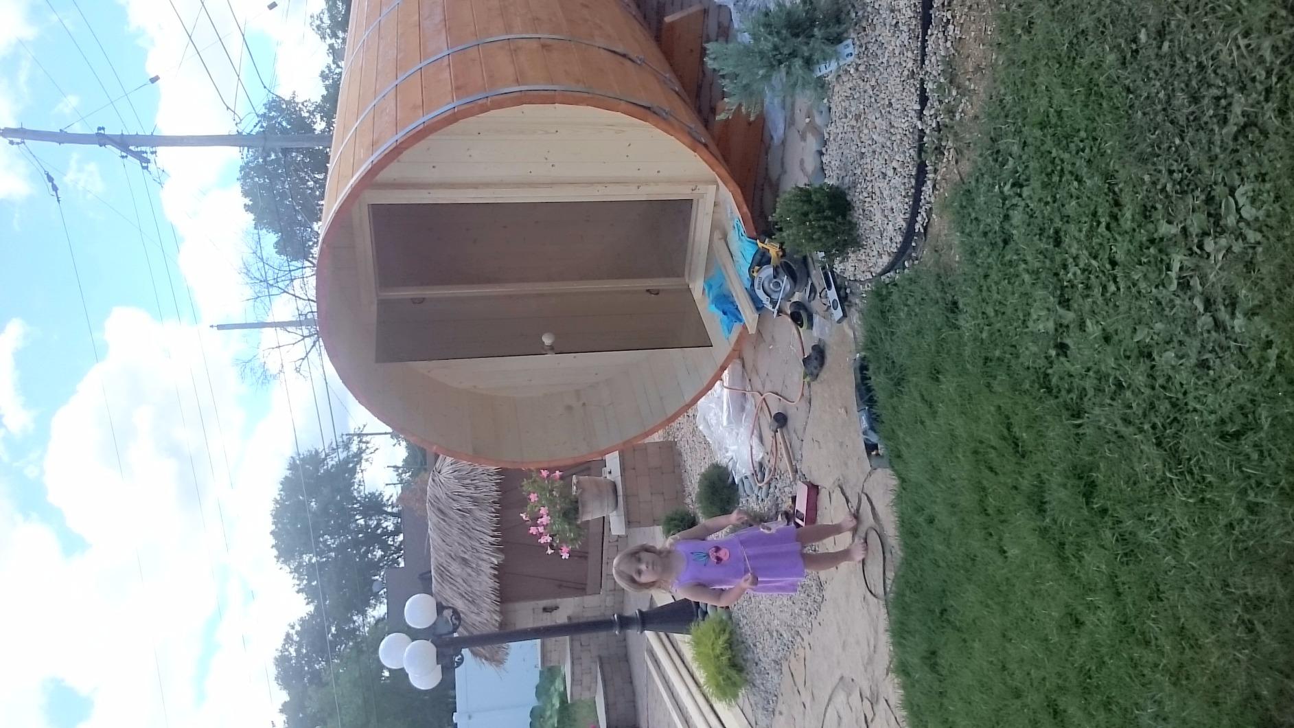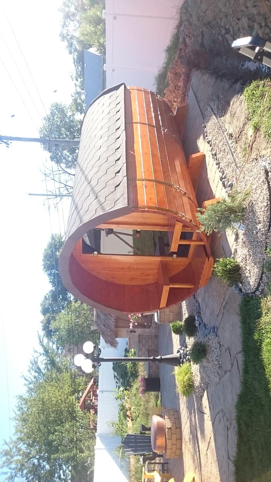 With 6'8" diameter x 78.7" inside length this sauna will comfortably seat 8 adults. Two windows on the back wall let in ample amount of natural light. Separate dressing room provides space for relaxation and storage. Standard options included are two windows and front porch. Unlike the models of competitors, our barrel saunas come with roof shingles which will add to the life span of your investment.